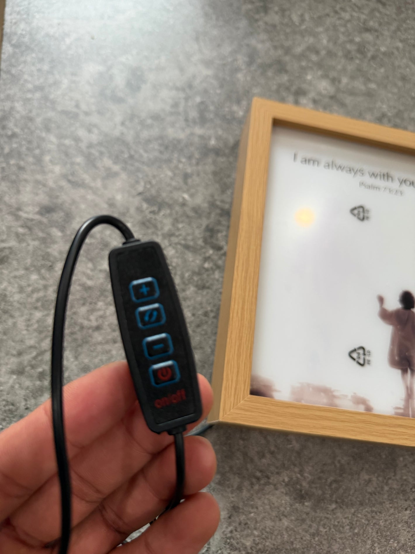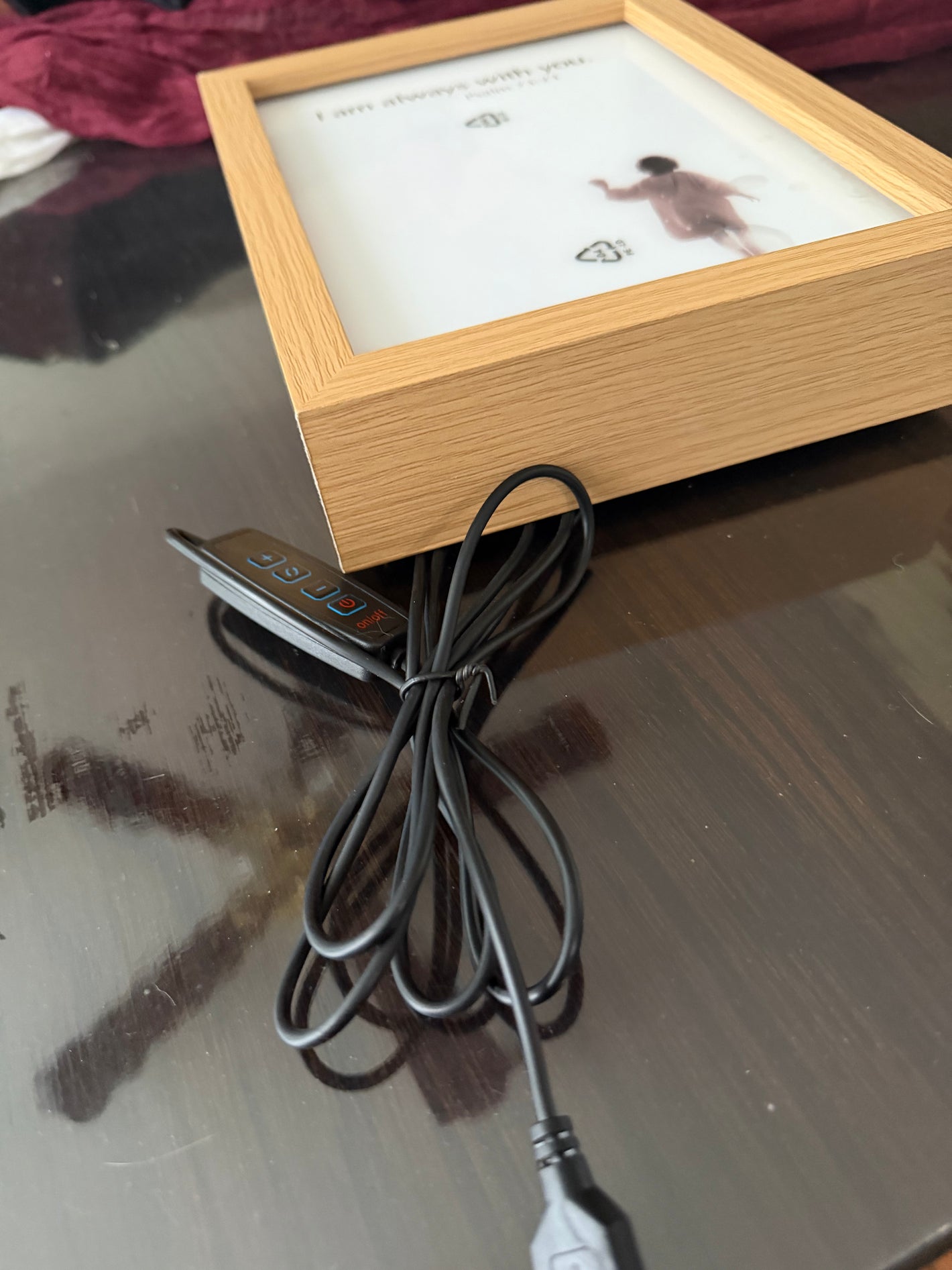 The frame uses a USB power cable and includes a remote control, allowing you to easily adjust the light to warmer or cooler tones based on your preference. It can be connected to wall adapters, laptops, or power banks.